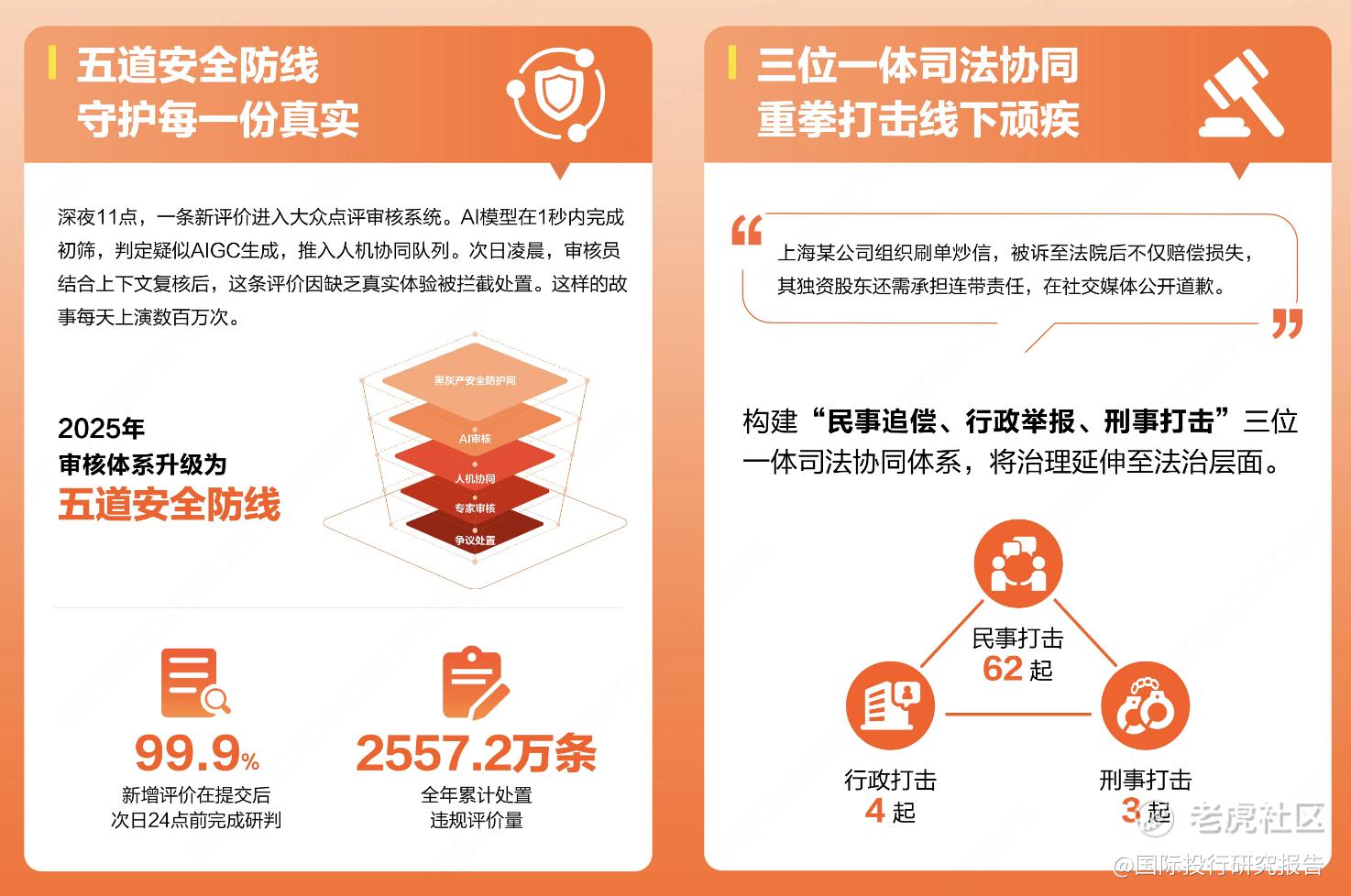 面对行业痛点,大众点评率先发力。过去的一年,在人工智能技术高速发展的时代趋势下,大众点评率先推进AI智能体赋能人工,升级评价审核体系,聚焦评价治理领域的细分场景痛点,构建精细化的识别处置能力,将原有的四道安全防线升级为“黑产安全防护网—AI审核—人机协同—专家审核—争议处置”五道安全防线,构建起了精细化的虚假评价识别处置能力。