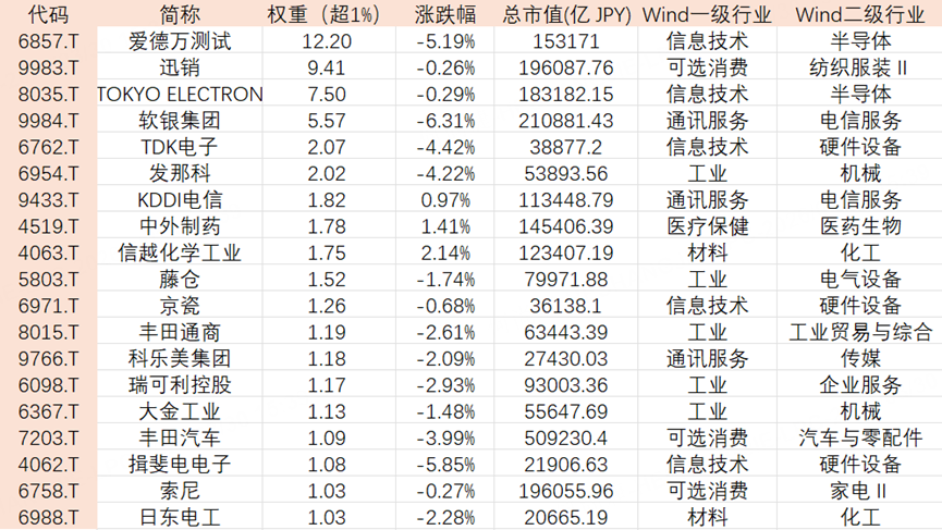 由于权重高度集中,科技股权重拖累了指数股:爱德万权重超12%,软银超5%,TDK电子和发那科也超2%。这些公司一旦同步回调,对指数的影响直接放大。