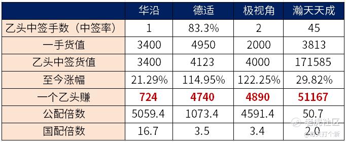 我们看一下今天上市的四家截至写稿的涨幅、一个乙头的货值、以及赚钱效益。