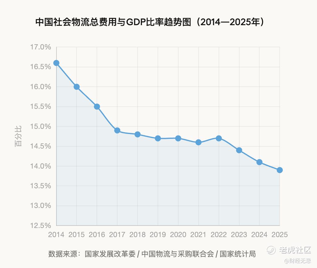 数字揭示了问题的量级。2025年,全国社会物流总费用占GDP的比率降至13.9%,国家发改委专门标注“首次降至14%以下”——攻坚多年才跨过这道门槛。