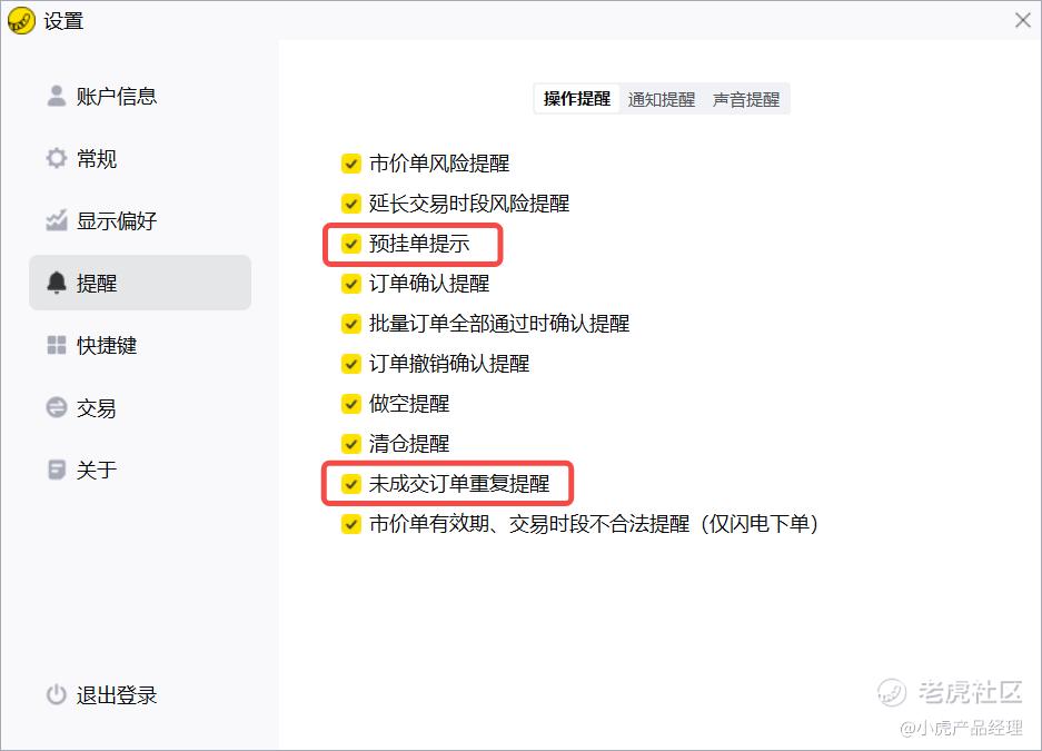 预挂单提醒勾选时,如果该订单不会立即下出去,将会弹窗提醒。未成交订单重复提醒勾选时,将在下单前检查是否有未成交订单,如有将会弹窗提醒