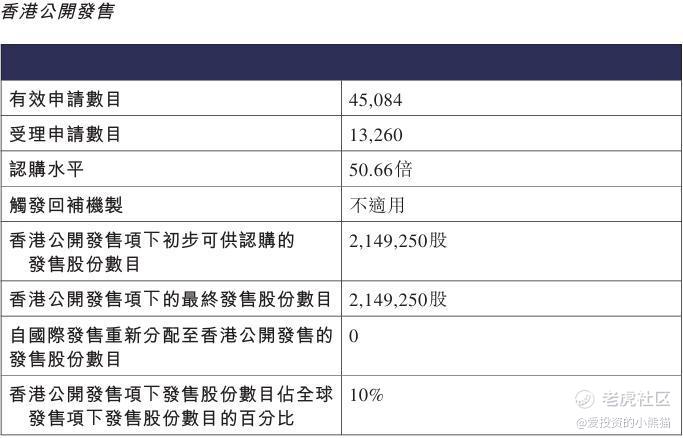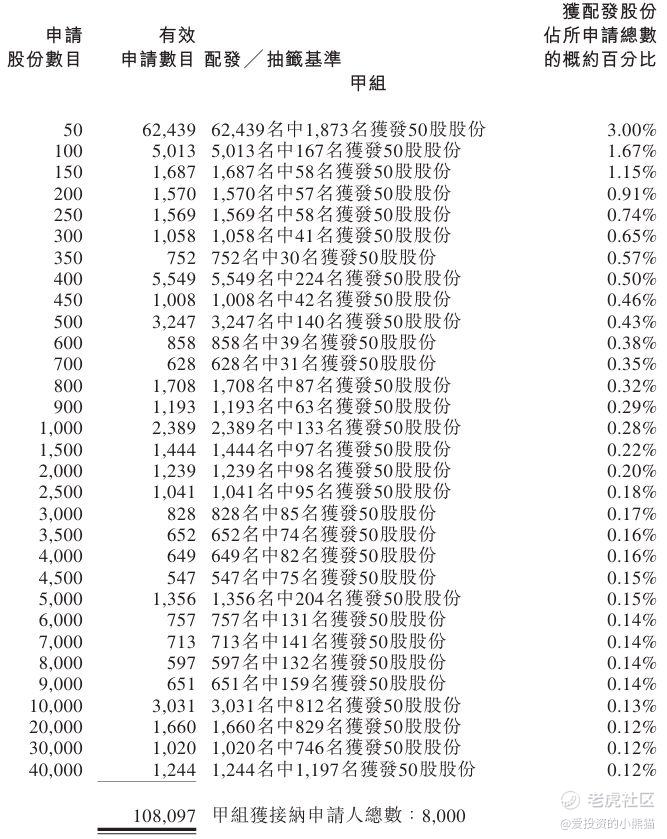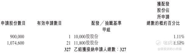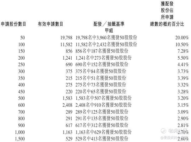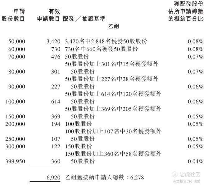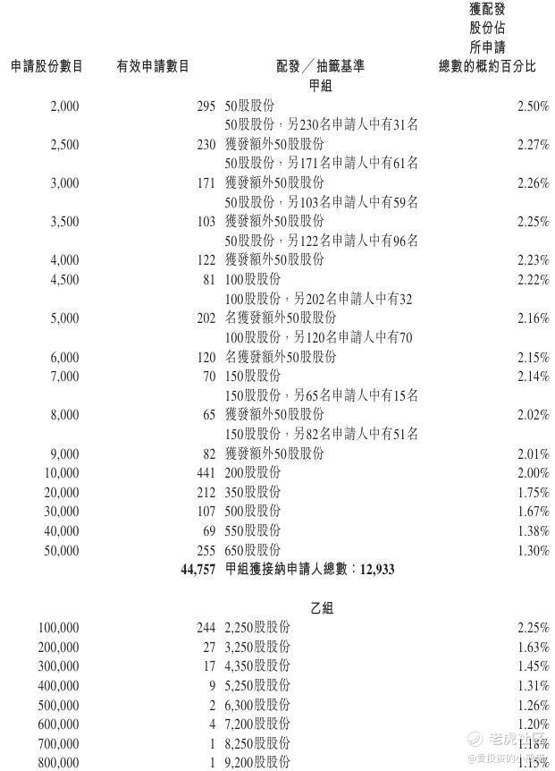 配售情况:45084人认购,这次公配50.66倍,由于机制B分配,无回拨比率,国配有1.95倍,一手中签率20.00%,认购40手稳中1手,同时乙组327人申购,其中顶头槌申购21张,获配率1.10%-2.25%。