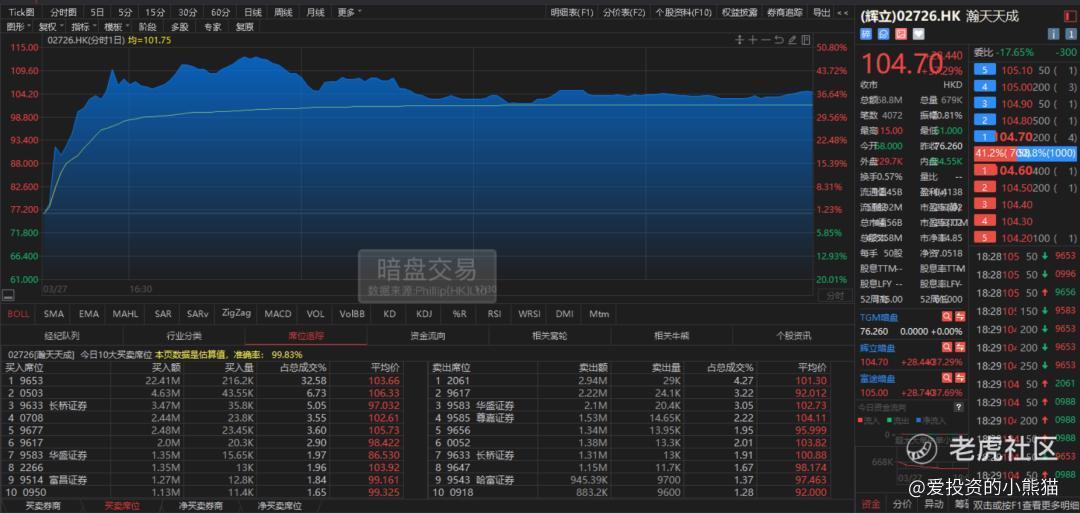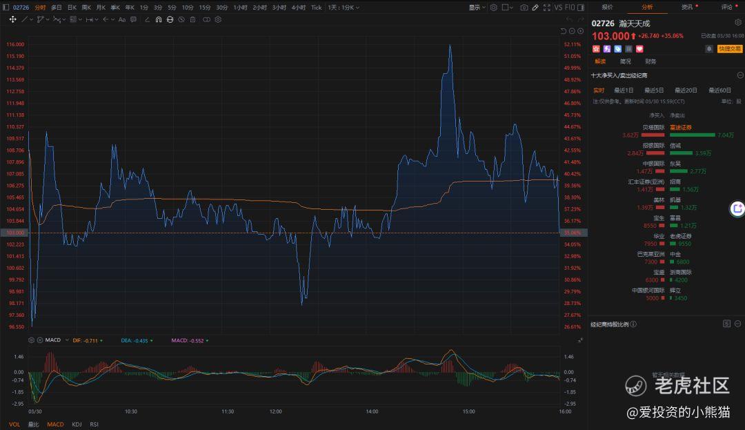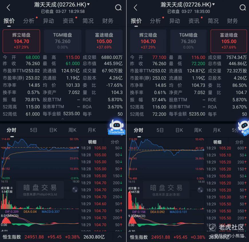 瀚天天成(02726.HK)辉立暗盘以68.00港元低开,立马下探到最低点61.00港元企稳反弹,最高冲到115.00港元,再震荡整理,尾盘以104.70港元报收,涨幅为37.29%,振幅70.81%,成交6880万港元。