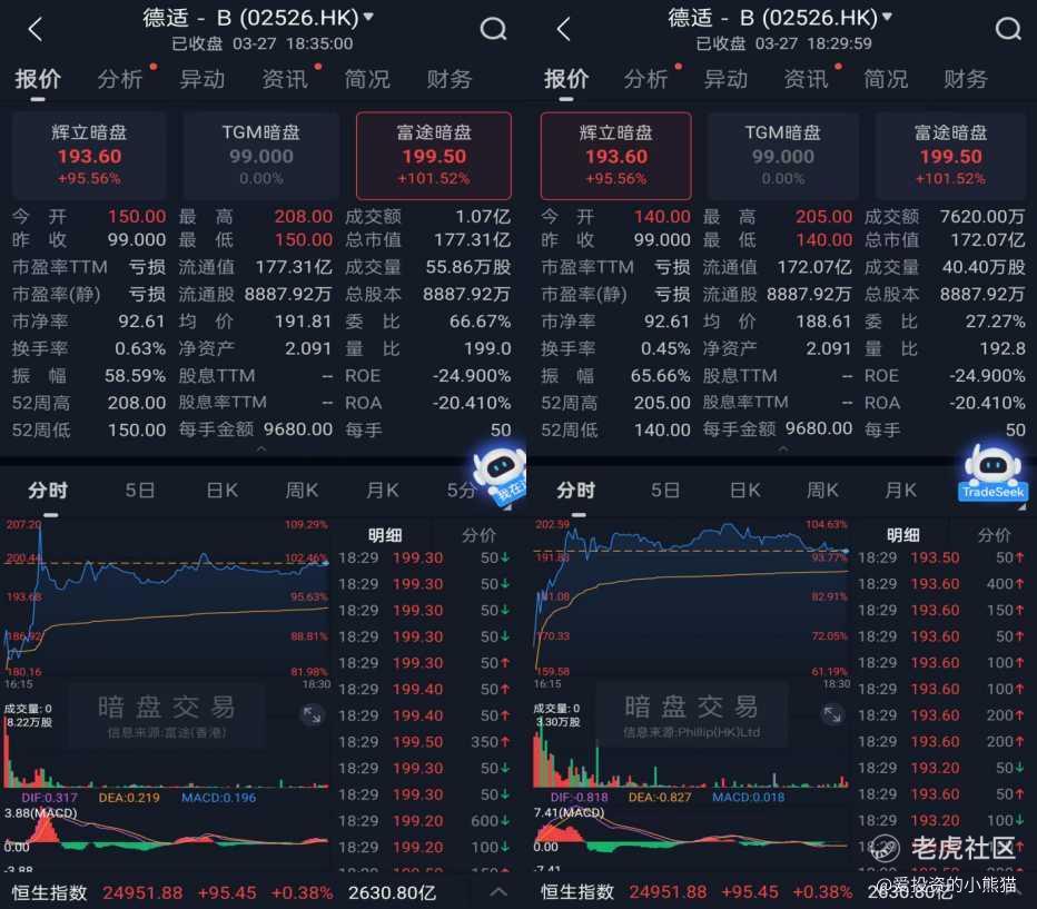 德适-B(02526.HK)辉立暗盘以140.00港元高开,一直上冲到最高点205.00港元后回落,再震荡整理,尾盘以193.60港元报收,涨幅为95.56%,振幅65.66%,成交7620万港元。