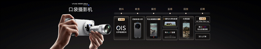创作自由不只属于静态影像,为此vivo X300 Ultra视频能力再度升级。不仅全焦段视频高规格,而且全焦段视频好画质。防抖方面,全焦段OIS光学视频防抖,其长焦3°OIS光学防抖能力,即使装上增距镜拍摄,依然稳定出片。收音方面,四麦收音大师,支持6大场景化收音预设,一键获得高质量的收音,还可以连接专业的无线麦,实现收音自由。在监看上,2K蔡司大师色彩屏作为取景器,全场景取景和监看时色彩更真实;参考专业电影摄影机全新推出的专业录像模式Pro,参数布局清晰,调节更便利,一键清屏功能只需轻点屏幕,便可沉浸式构图;开放的自定义3D Lut导入监看功能,让用户可以将常用的调色LUT直接加载进取景器,拍摄时就能预览最终的电影色调。在回放上,全新升级的大师双扬,上扬净腔体积提升至270%,堪比电影级声场。最后也是最重要的一步,在后期方面,全焦段4K 120fps 10bit Log,422采样,APV帧内编码,完整将色彩和影调的决定权交给后期;同时vivo Log已适配ACES专业后期流程,让Log素材能与专业电影摄影机素材在同个色彩空间协同调色,无缝对接影视制作体系。此外,还可直接在相册中预览、烧录3D Lut,vivo摄影App还内置3D Lut库,定期更新风格化预设,让用户轻松获得独特的调色风格。V单真正打通了从拍摄到后期、完整可控的专业视频创作工作流,当用户在观看演唱会或体育赛事时,抬手就能拍出转播级画面。