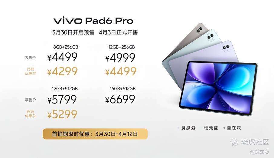 跟随vivo X300 Ultra、vivo X300s一同发布的还有vivo Pad6 Pro,以全面进化的旗舰实力推动安卓正式开启4K性能平板时代。搭载13.2英寸4K原彩屏,支持杜比视界,视听体验更沉浸;配合第五代骁龙8至尊版,实现性能跨越式升级;集成PC级WPS和剪映专业版,学习办公与创作表达高效合一。提供松弛蓝、灵感紫、自在灰三款配色,上市价格4499元起。目前已经开启预售,4月3日正式开售,首销期间可享多重优惠。