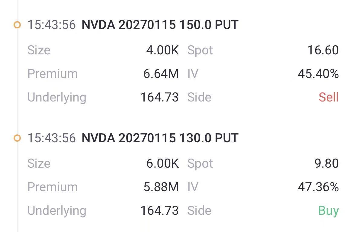 牛市看跌价差组合:Sell 2027-01-15 150.0 Put / Buy 2027-01-15 130.0 Put。此策略通过卖出较高行权价的Put并买入更低行权价的Put来构建,当英伟达股价维持在143美元以上时即可盈利。