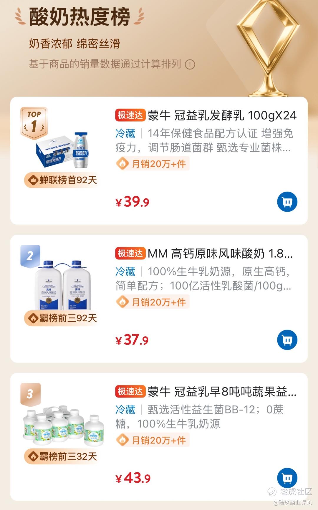 传统渠道继续精耕细作,提升运营效率,稳住基本盘。而在新兴势能渠道上,则全面拥抱会员店、零食量贩、即时零售、内容电商等,用定制化产品实现精准触达。比如为山姆定制的冠益乳早8吨吨桶、为盒马定制的每日鲜语0乳糖牛乳,推出即成爆款,这些不是简单的铺货,而是“产品适配渠道”的典型打法。陆玖商业评论发现,山姆的“酸奶热度榜”中,前三名两款都是蒙牛的产品,并且蝉联多天。