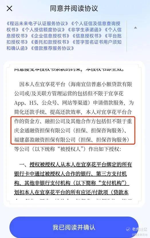 然而,协议文本中除明确列出关联方海南宜信小贷外,并未清晰展示其他具体合作金融机构的名称,严重侵害了用户的知情权。