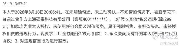 如在3月19日,一用户表示,“本人于2026年3月18日20:06:41,在未明确勾选、未主动确认、不知情的情况下,被宜享花平台通过合作方上海砺带科技有限公司(客服400*******),以‘代收其他’名义违规扣款299元;扣款均为非本人授权、未使用任何会员及增值服务,属于强制搭售、变相砍头息、未经授权扣费的违规行为。”