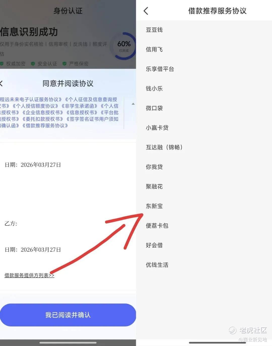 那么网贷平台呢?宜享花悄悄藏在了《借款推荐服务协议》的最下方,即如图显示的“借款服务提供方列表”里。