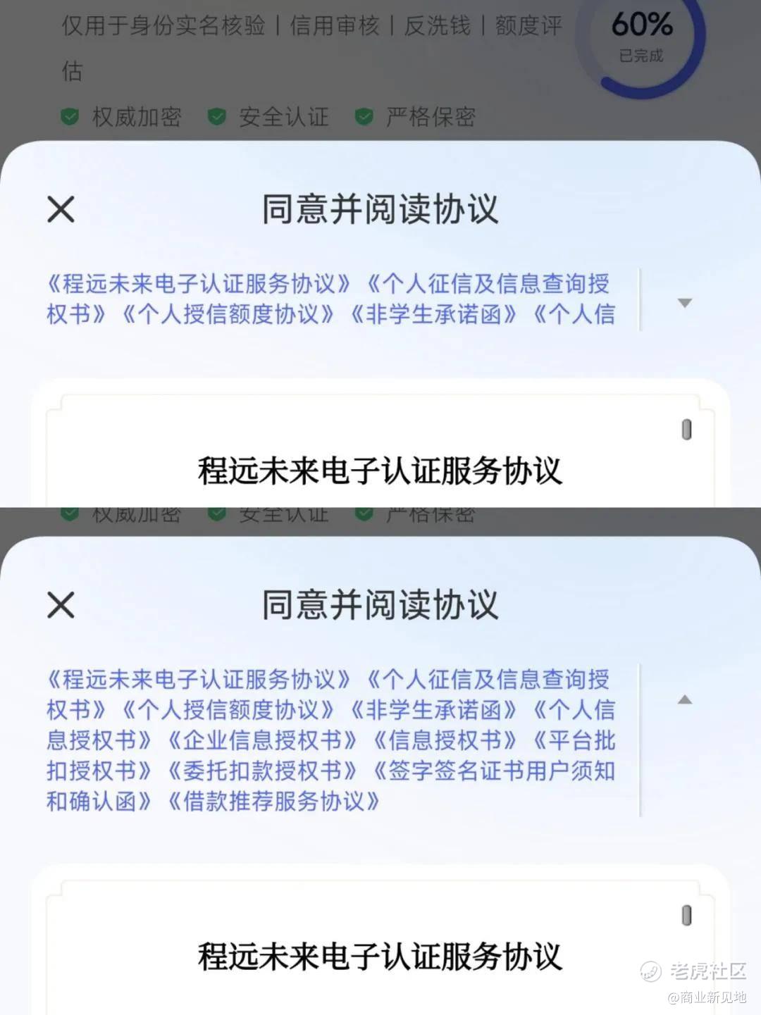 点击领取额度并提交身份信息后,如下图,对于用户来说,可以直观看到的协议似乎仅有《程远未来电子认证服务协议》《个人征信及信息查询授权书》《个人授信额度协议》《非学生承诺函》《个人信息授权书》这5份,而且可供直接阅读的也仅有《程远未来电子认证服务协议》这一份。