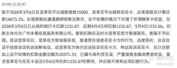 在黑猫投诉上,一名借款用户于3月9日反映,“我于2026年3月6日在宜享花平台借款借款15000元,宜享花平台跳转花花卡,此笔借款总计需还款16673.33元。在借款期间遭遇捆绑销售及欺诈,在不知情的情况下开通了所谓随享卡权益,在2026年3月6日从我的银行卡扣款1231.67元,后期4月4日将扣款1232.67元,5月4日1232.66元。扣款主体均为广州本善信息服务有限公司。”
