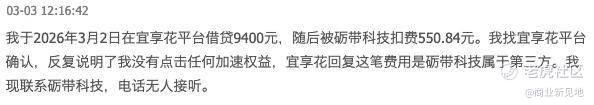 与这名用户有相似遭遇的借款人,在宜享花平台并不少见。如在3月3日,另一名借款用户称,“我于2026年3月2日在宜享花平台借贷9400元,随后被砺带科技扣费550.84元。我找宜享花平台确认,反复说明了我没有点击任何加速权益,宜享花回复这笔费用是砺带科技(扣的),属于第三方。我联系砺带科技,电话无人接听。”