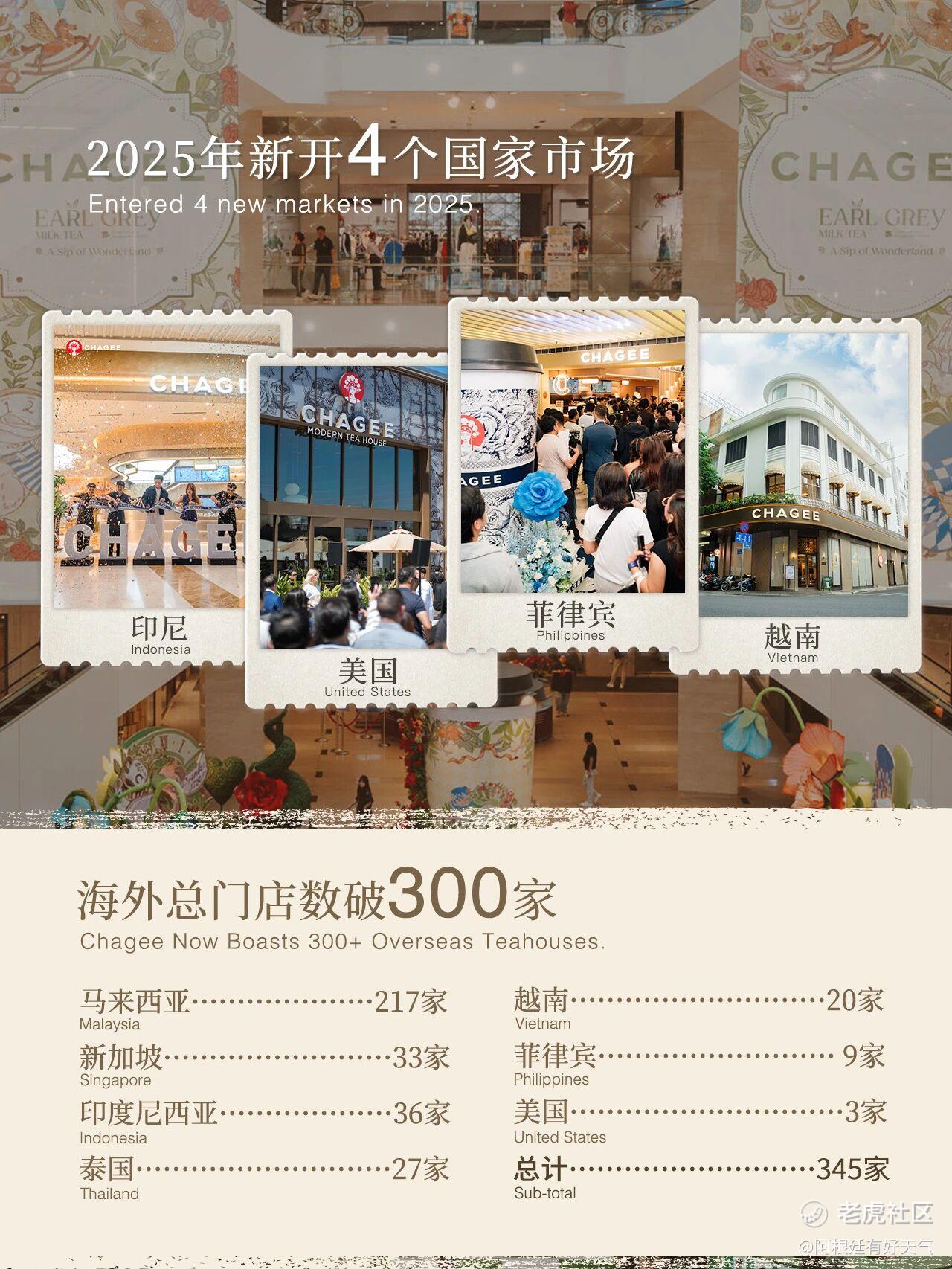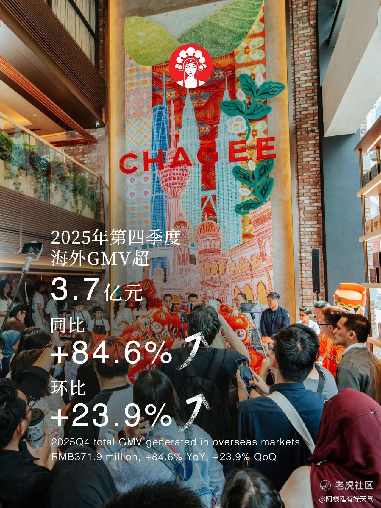 $霸王茶姬(CHA)$仔细看了下四季报,海外业务增速有点猛啊。四季度海外GMV同比涨了84.6%,而且这已经是连续第三个季度增长超75%了。门店在海外也开到了345家,覆盖7个国家。看来公司国际化这步棋走得挺坚决,东南亚和北美市场要是能持续打开,想象空间不小。