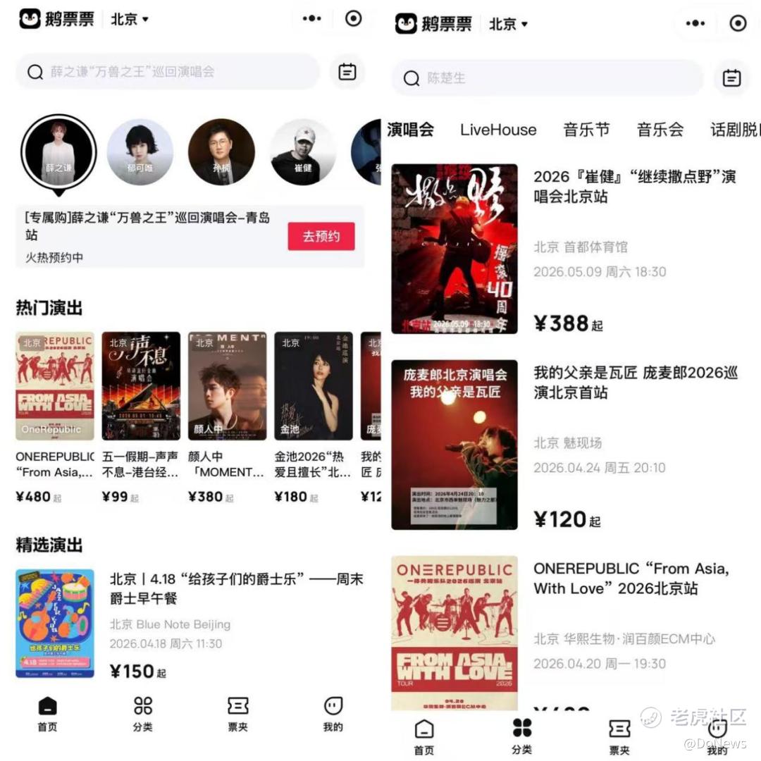 相较于网易云的“云村有票”主要是在站内聚合入口,专注整合第三方票务资源而未在站外独立运营,“鹅票票”走的是站外自建体系路线,意图掌握从流量到交易的全链条。从其已上线的项目来看,涵盖演唱会、音乐节、话剧脱口秀、艺术展览等多个品类,且对头部艺人资源的成功撬动,也预示着其在供应链端已开始破局。