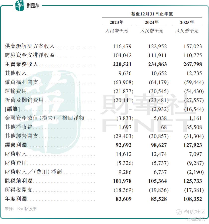 招股书显示,公司跨境资金安排的净收益在2025财年仍高达1.1亿元,占主营业务的41.4%。这是华富洋商业模式的核心,也是其维持高利润率的秘密武器。公司利用供应链服务产生的大量现金流,通过货币兑换和贸易结构化结算等方式创收。