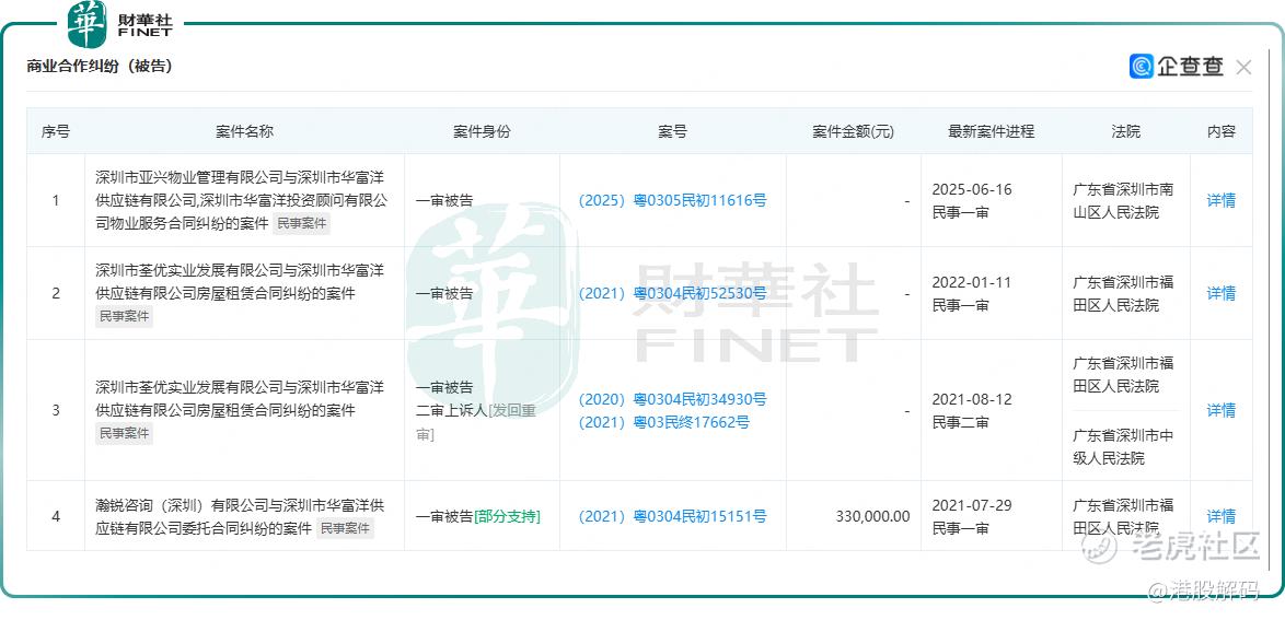 对于市场关注的司法诉讼方面,据企查查公开数据显示,深圳市华富洋供应链有限公司累计涉及5起司法纠纷案件,其中4起为商业合作类纠纷,公司均以被告身份涉案,纠纷类型涵盖物业服务合同纠纷、房屋租赁合同纠纷及委托合同纠纷;另有1起劳动纠纷案件,公司同样作为被告。