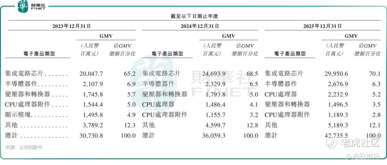 更令投资者侧目的,是华富洋业务结构与热门赛道的深度绑定。招股书显示,华富洋服务的客户遍及物联网通信、半导体、智能机器人解决方案及新能源等40多个垂直行业。其中,集成电路(芯片)的跨境供应链业务,占其总商品交易总额(GMV)的比重,从2023年的65.2%一路飙升至2025年的70.1%。这无疑踩中了“国产替代”与“AI浪潮”的双重风口,为其增长故事提供了产业背书。