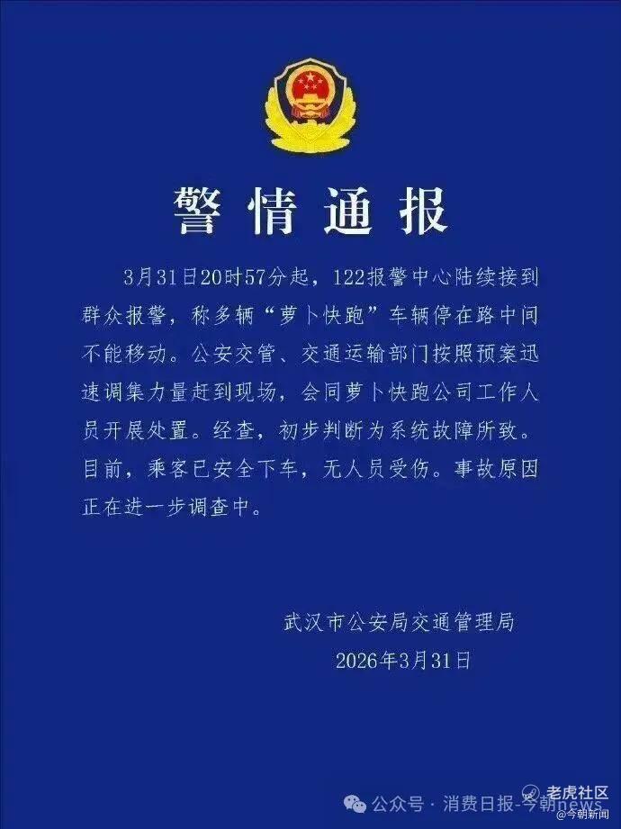 4月1日凌晨,武汉市公安局交通管理局发布警情通报,通报称:“3月31日20时57分起,122报警中心陆续接到群众报警,称多辆“萝卜快跑”车辆停在路中间不能移动。公安交管、交通运输部门按照预案迅速调集力量赶到现场,会同萝卜快跑公司工作人员开展处置。经查,初步判断为系统故障所致。目前,乘客已安全下车,无人员受伤。事故原因正在进一步调查中。”