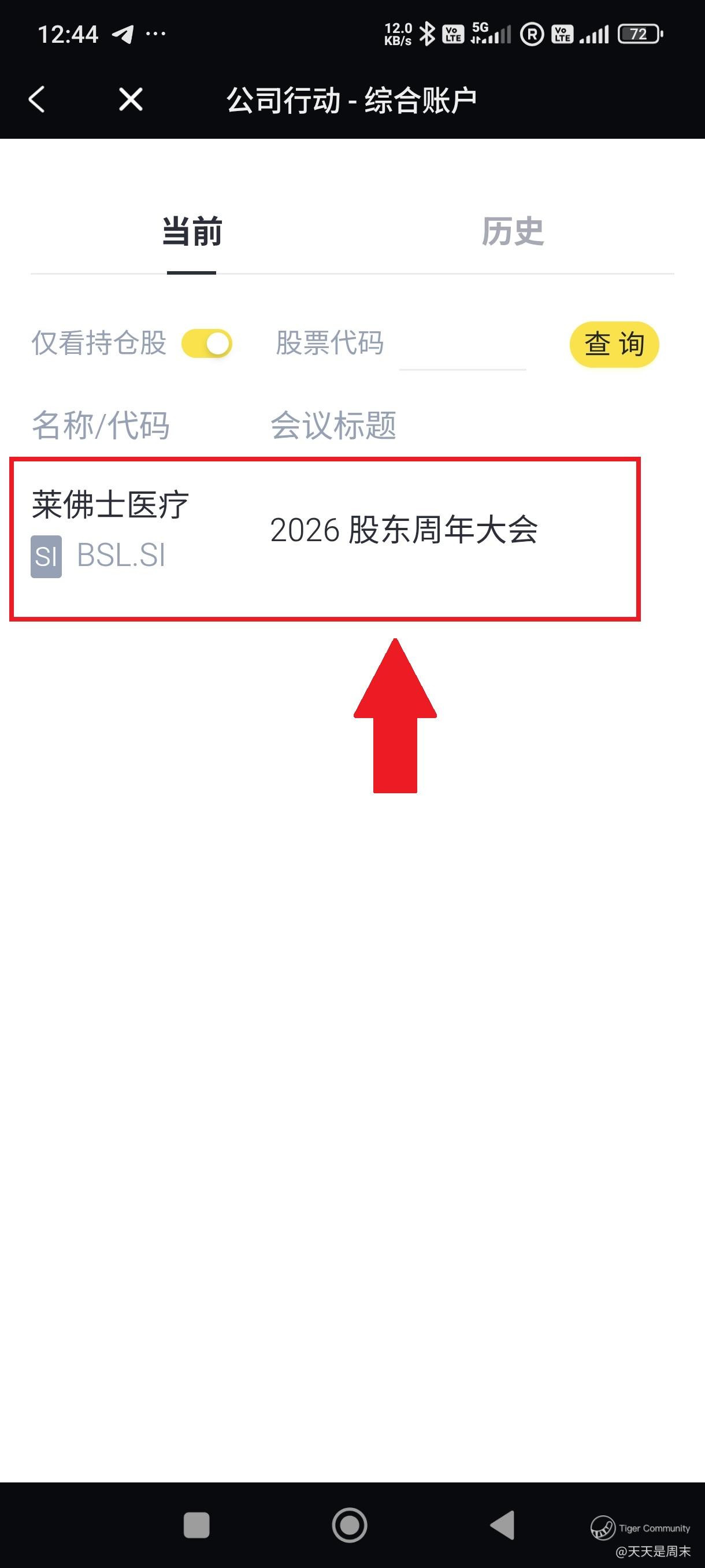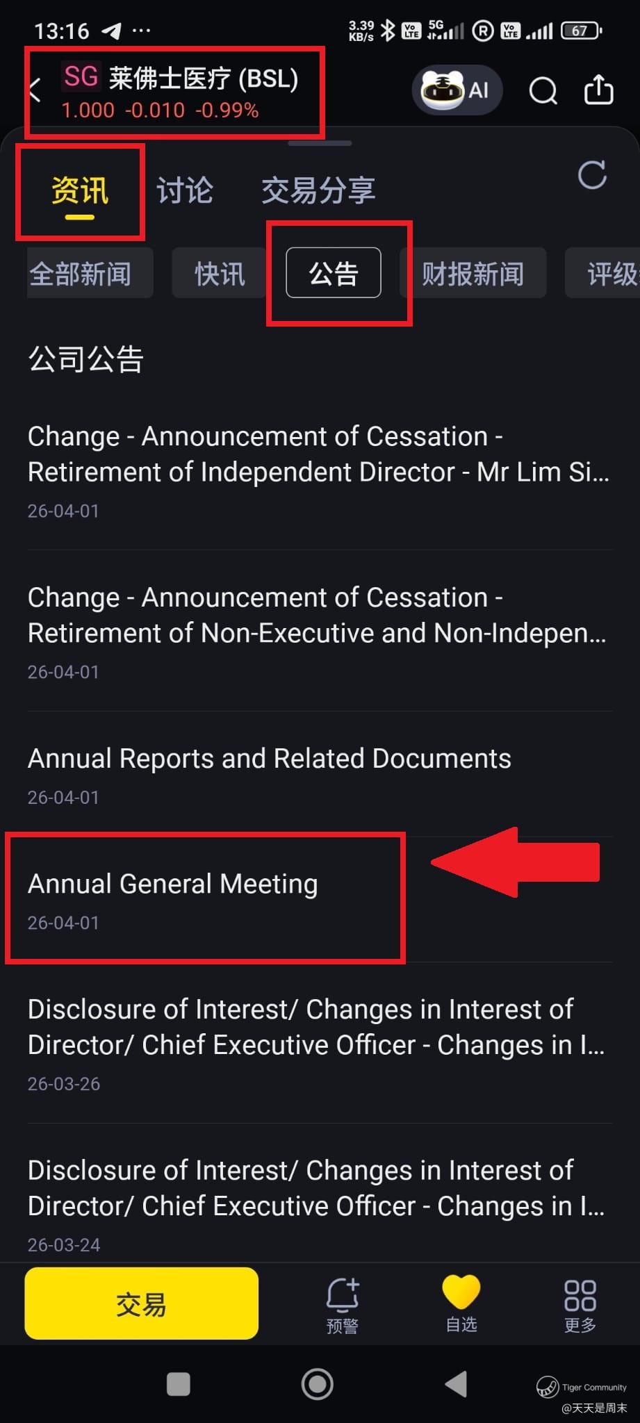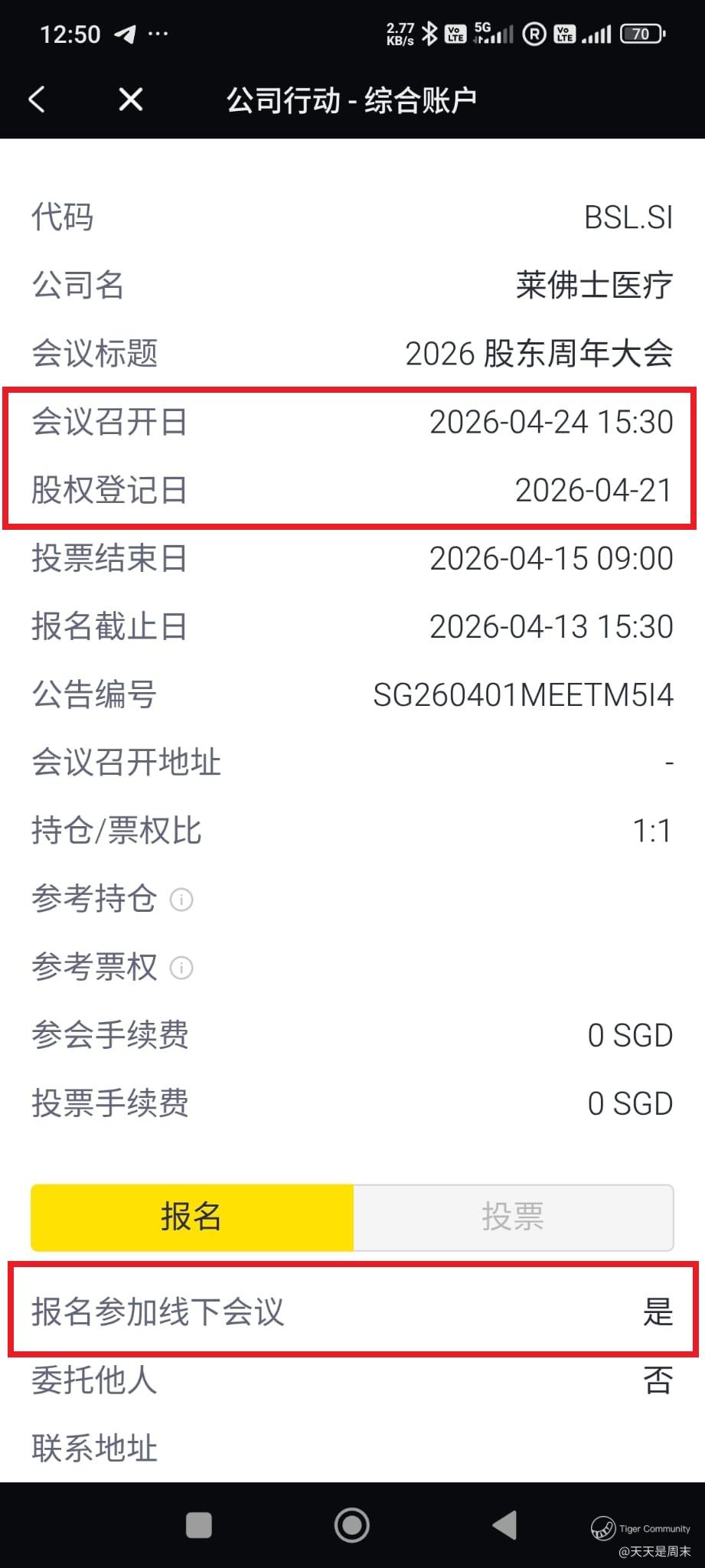 最近出席了某某公司的AGM , 碰巧遇到几位老虎用户,他们询问我是怎么在老虎平台上登记出席股东大会。我和大家分享一下吧。今天就用莱佛士医疗 $Raffles Medical(BSL.SI)$ 在24-04-2026 的股东大会作为例子。有人到时也会过去吗?可以在下面留言哦。
