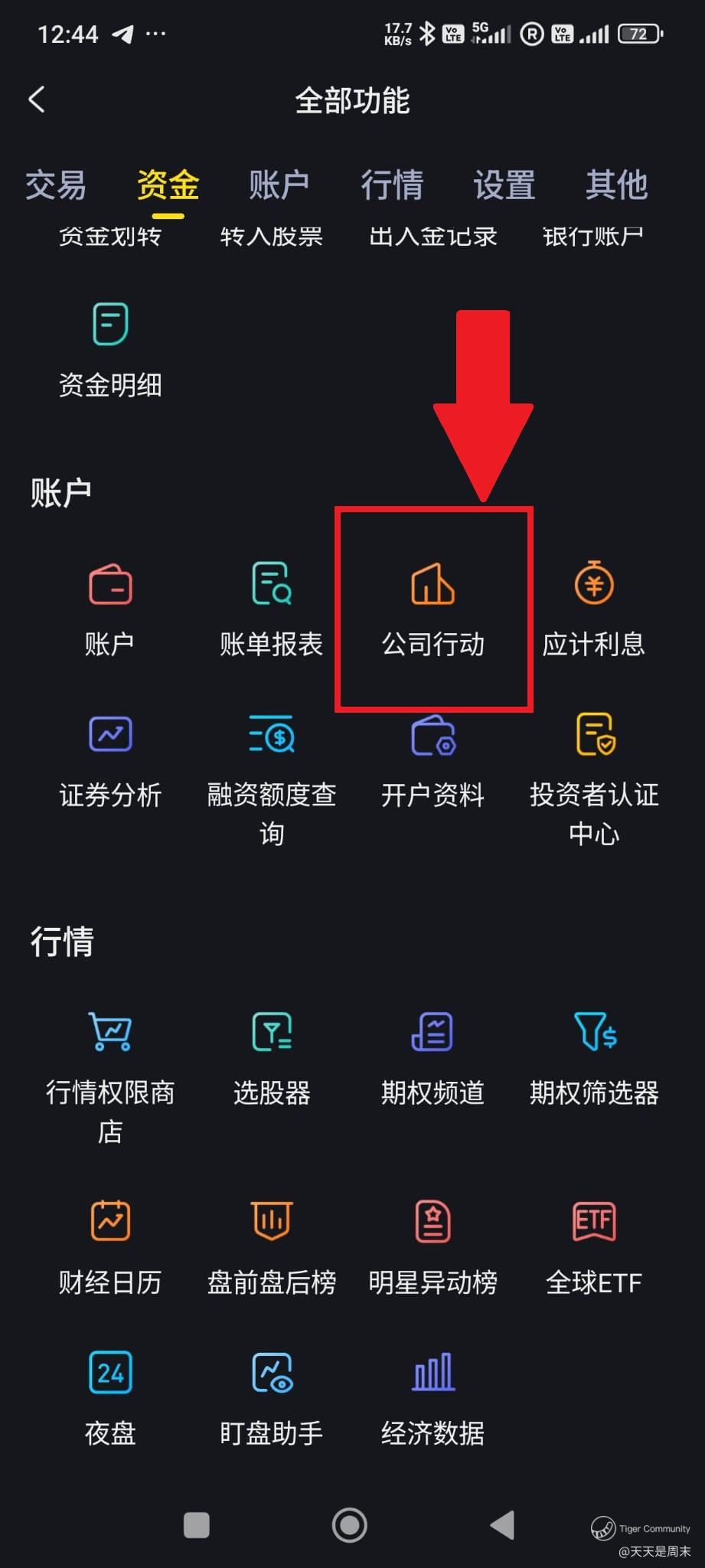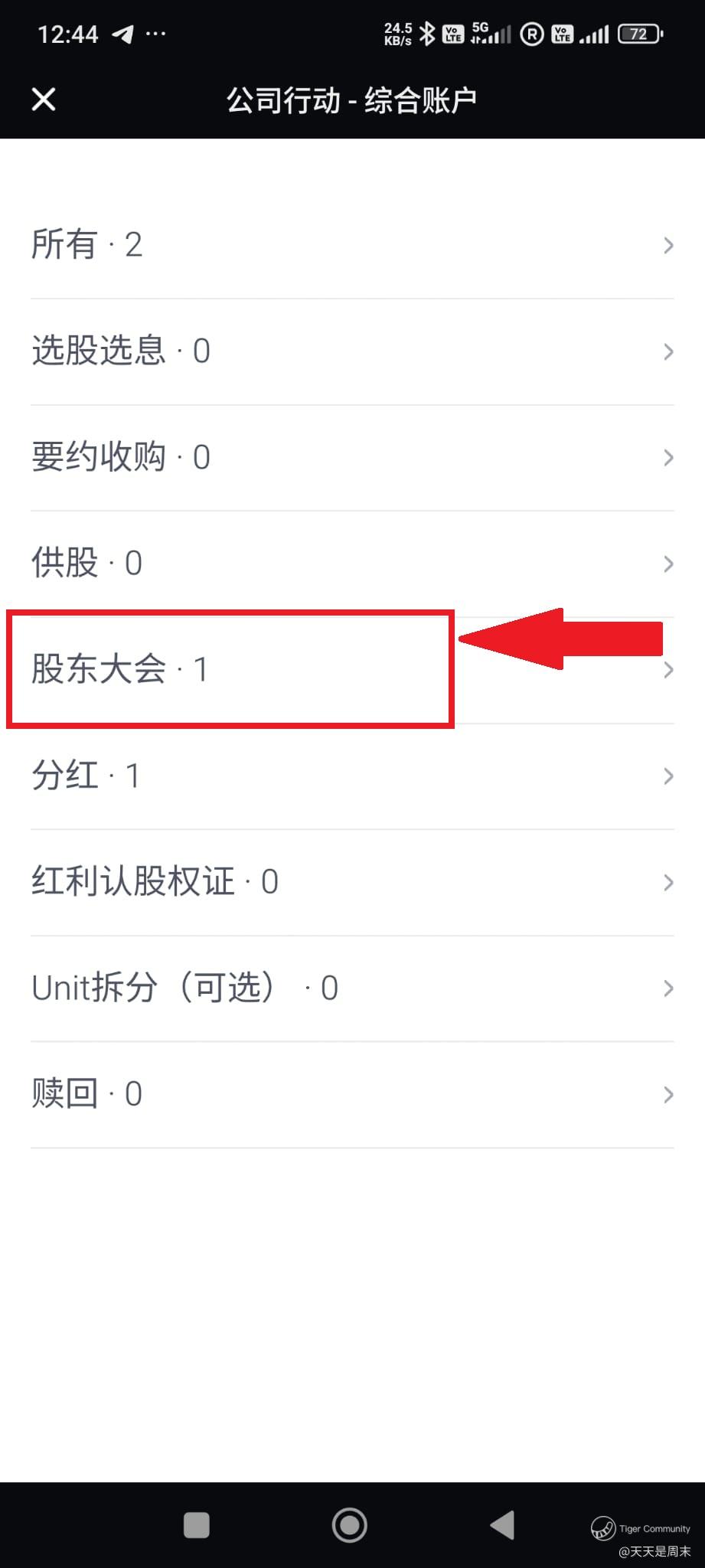 在老虎APP , 下面选择“持仓” —“更多” — 搜索点击“公司行动”