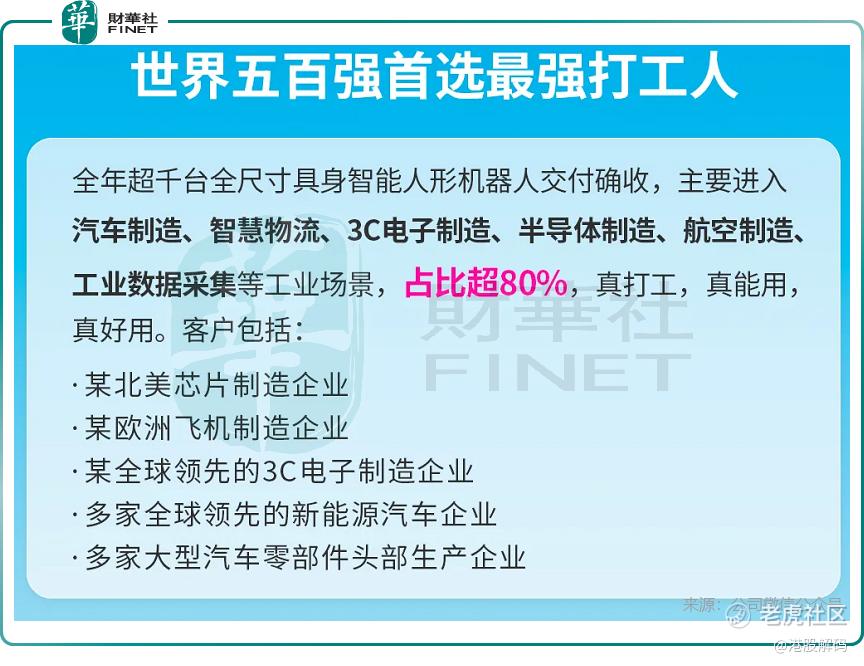公司披露的数据显示,全年超千台全尺寸具身智能人形机器人交付确收,超过80%进入了汽车制造、智慧物流、3C电子制造、半导体制造等工业场景。其客户名单堪称“全球工业明星队”:某北美芯片制造企业、某欧洲飞机制造企业、某全球领先的3C电子制造企业、多家全球领先的新能源汽车企业、多家大型汽车零部件头部生产企业。