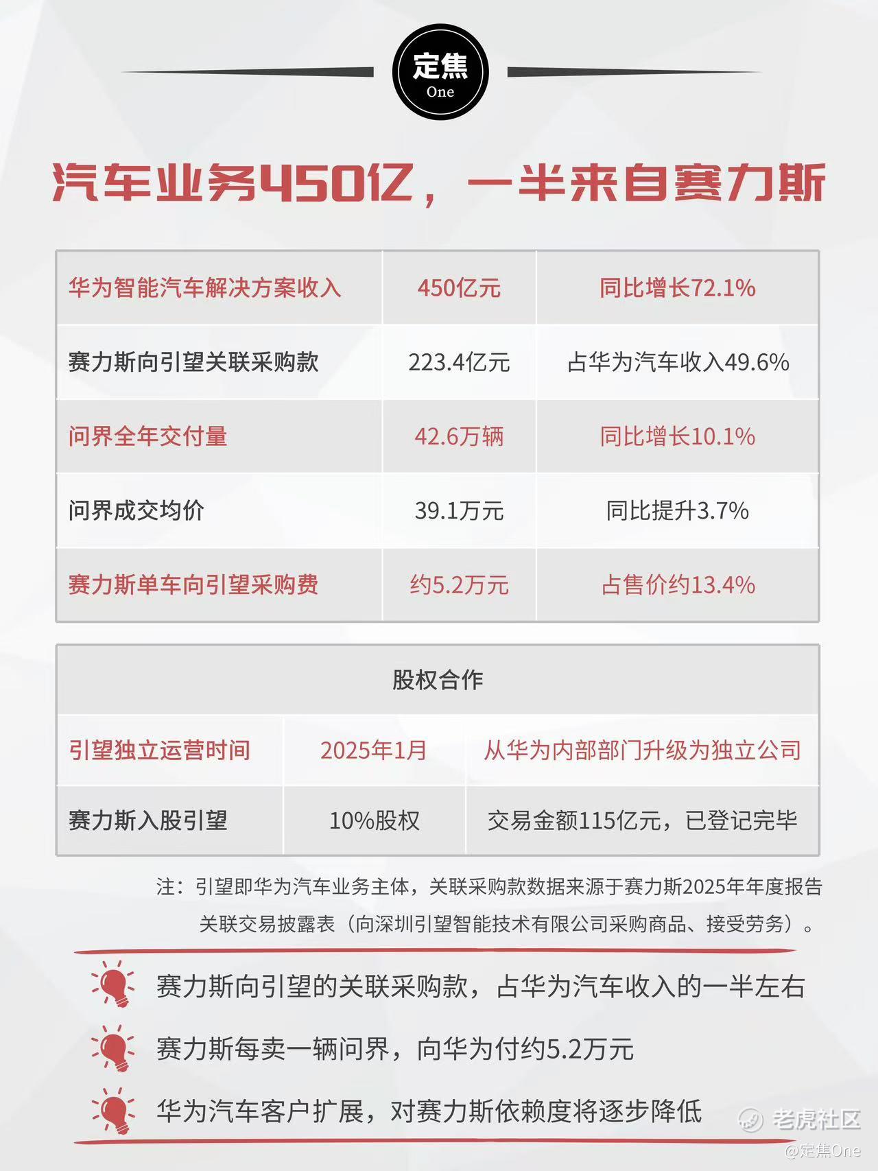 随着2025年1月引望独立运营,赛力斯以115亿元入股10%,两家公司变成了有股权纽带的合作伙伴。