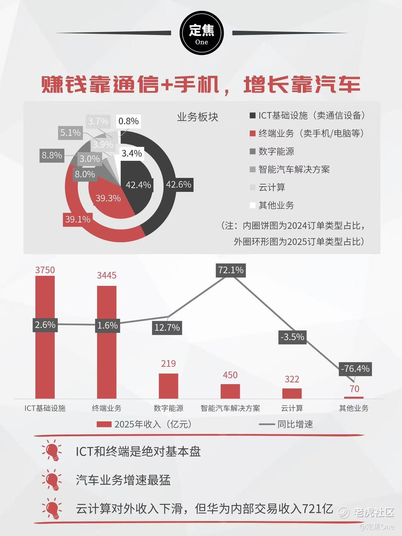 **五大业务中,约八成收入来自ICT基础设施(通信设备)和终端业务(手机、电脑等),格局没有太大变化。