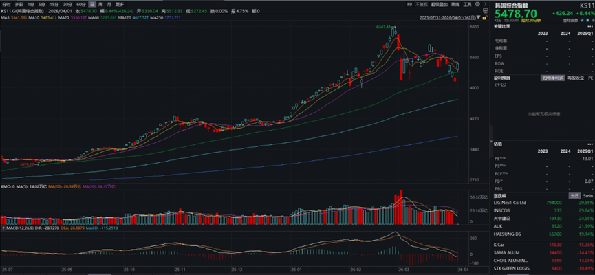 韩股今日明显反弹,KOSPI指数收于5478.70点,单日上涨8.44%。盘中指数快速拉升,期货涨幅超过5%触发程序化交易暂停,KOSDAQ 150期货也触发熔断。此前指数一度回落至4900点附近,本轮反弹基本恢复近一周跌幅,市场情绪有所修复。
