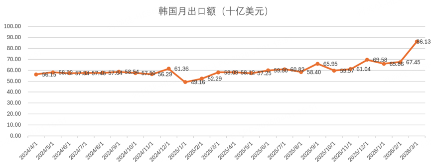今天,韩国公布出口数据,3月出口额为861亿美元,较2月的674亿美元增加约187亿美元,达到近两年来最高水平: