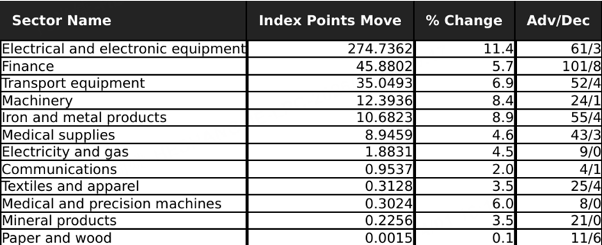 从结构来看,半导体板块是今日上涨的主要推动力。三星电子单日盘中上涨约13%,为2001年以来最大涨幅,SK海力士上涨9.68%。三星电子是KOSPI权重最高的公司,对指数贡献最大,叠加SK海力士的同步上涨,带动指数快速上行。电子板块整体走强,超过700只个股上涨: