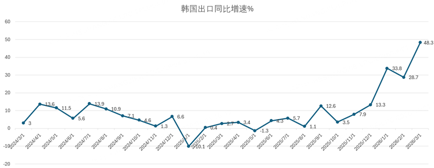 出口同比增速在今年以来明显抬升,1月升至33.8%,2月维持在28.7%的较高水平,3月进一步升至48.3%,较2月再提升接近20个百分点,创下这两年区间内最高值: