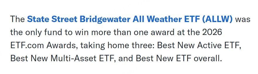 近期,道富桥水全天候ETF $SPDR BRIDGEWATER ALL WEATHER ETF(ALLW)$ 表现优异,成为2026年ETF.com大奖中唯一一只荣获多项殊荣的基金,并因此成为新闻焦点。