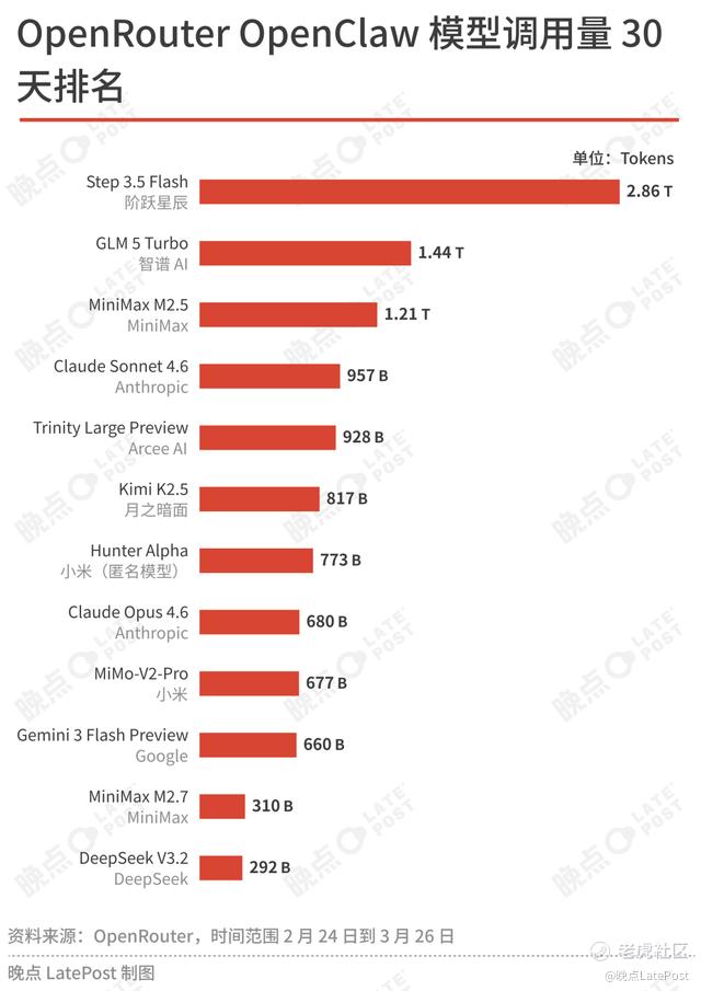 晚点:刚才你也提到了 OpenClaw 和中国开源模型的结合。在 OpenRouter(大模型接口聚合平台)上能看到 Token 消耗量最多的主要是中国模型,比如阶跃、MiniMax、Kimi、智谱,还有小米的新模型,都上榜了。