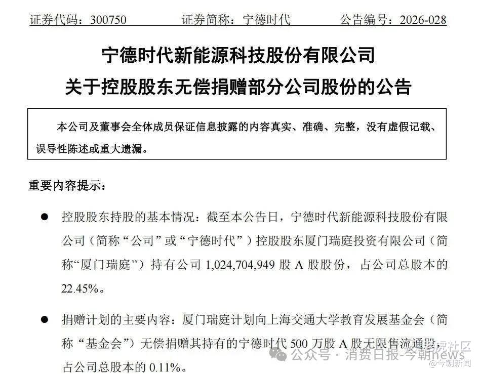 3月31日晚,宁德时代公告称,3月31日,公司接到控股股东厦门瑞庭投资有限公司通知,其与上海交通大学教育发展基金会签订了《上海交通大学“曾毓群教育基金”捐赠协议书》,厦门瑞庭拟向基金会无偿捐赠其持有的宁德时代500万股A股无限售流通股。