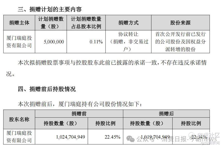 据公告,厦门瑞庭此次无偿捐赠其持有的宁德时代500万股A股无限售流通股,占公司总股本的0.11%。截至公告日,厦门瑞庭持有宁德时代10.24亿股A股股份,占公司总股本的22.45%;捐赠完成后,其持股比例将降至22.34%。
