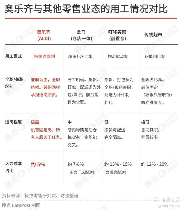 奥乐齐的办法是推行通岗,高比例使用小时工。一个奥乐齐标准门店通常配备 14 名员工,其中全职员工 4-5 人,其余均为兼职员工。我们了解到,奥乐齐可以将这一成本控制在门店营业额的 5% 左右。作为对比,传统零售企业需要为此付出约 12 - 20% 的成本。