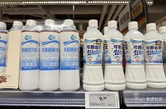 奥乐齐单瓶售价 3.6 元的乳酸菌饮品,与售价 9.9 元的同类社会品牌商品被放在同一个货架上销售。