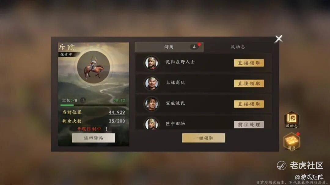 总体而言,游戏的养成看着内容挺多,一开始会忙个不停。但相对于早年的SLG,《三王》的大方向还是降肝减氪。很多操作都是玩家初期需要手动,随后就都有一键操作的替代方案。比如寻访到后面不需要玩家手动寻找,可以一键领取奖励。各类事件也都可以直接跳过,无需过多点击,直接领取奖励。