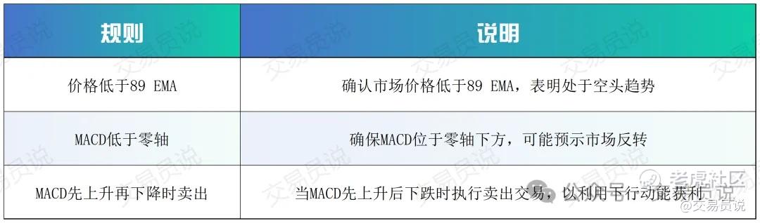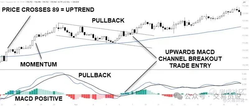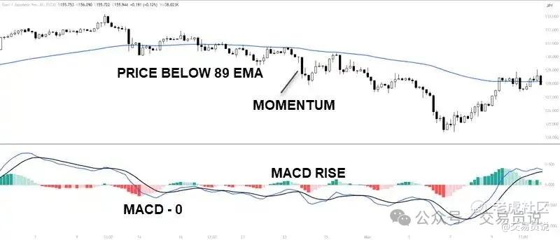来看一个详细示例:假设市场价格运行在89周期EMA下方,这通常意味着当前处于空头趋势。这是一个初步信号,表明可以考虑做空交易(卖出基础货币、买入报价货币)。为了提高交易成功的概率,还需要MACD位于零轴下方。这两个条件的结合意味着做多机会的胜率较低。