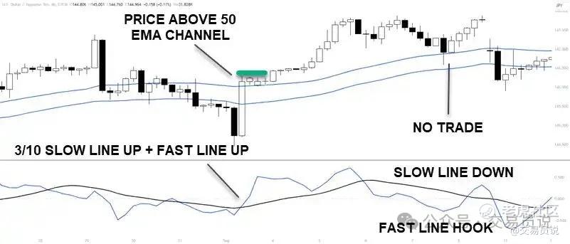 在前面的例子中:当慢线和快线同时向上,且价格位于50 EMA上方时,可考虑做多;如果慢线向下而快线钩头,即使价格显示上升,也不应进行做多。