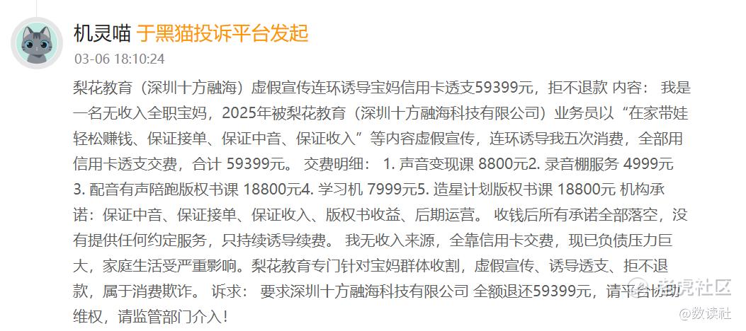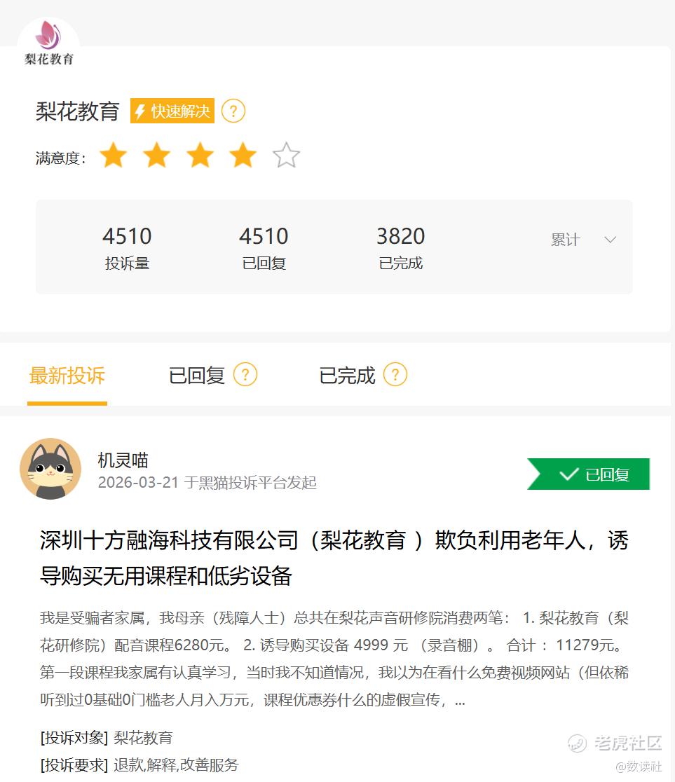 在发展的过程中,针对十方融海以及梨花教育的投诉激增。截至2026年4月2日,黑猫投诉平台包含梨花教育的投诉已达4510条。投诉内容多为诱导消费、虚假宣传、未能赚钱等。