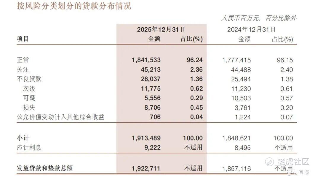 2025年末,不良贷款率1.36%,较上年末下降0.02个百分点,实现了连续改善。不良率改善的重要原因是对更多的不良贷款进行了核销及转出,2025年为278.1亿元,比2024年增加了4.2%。