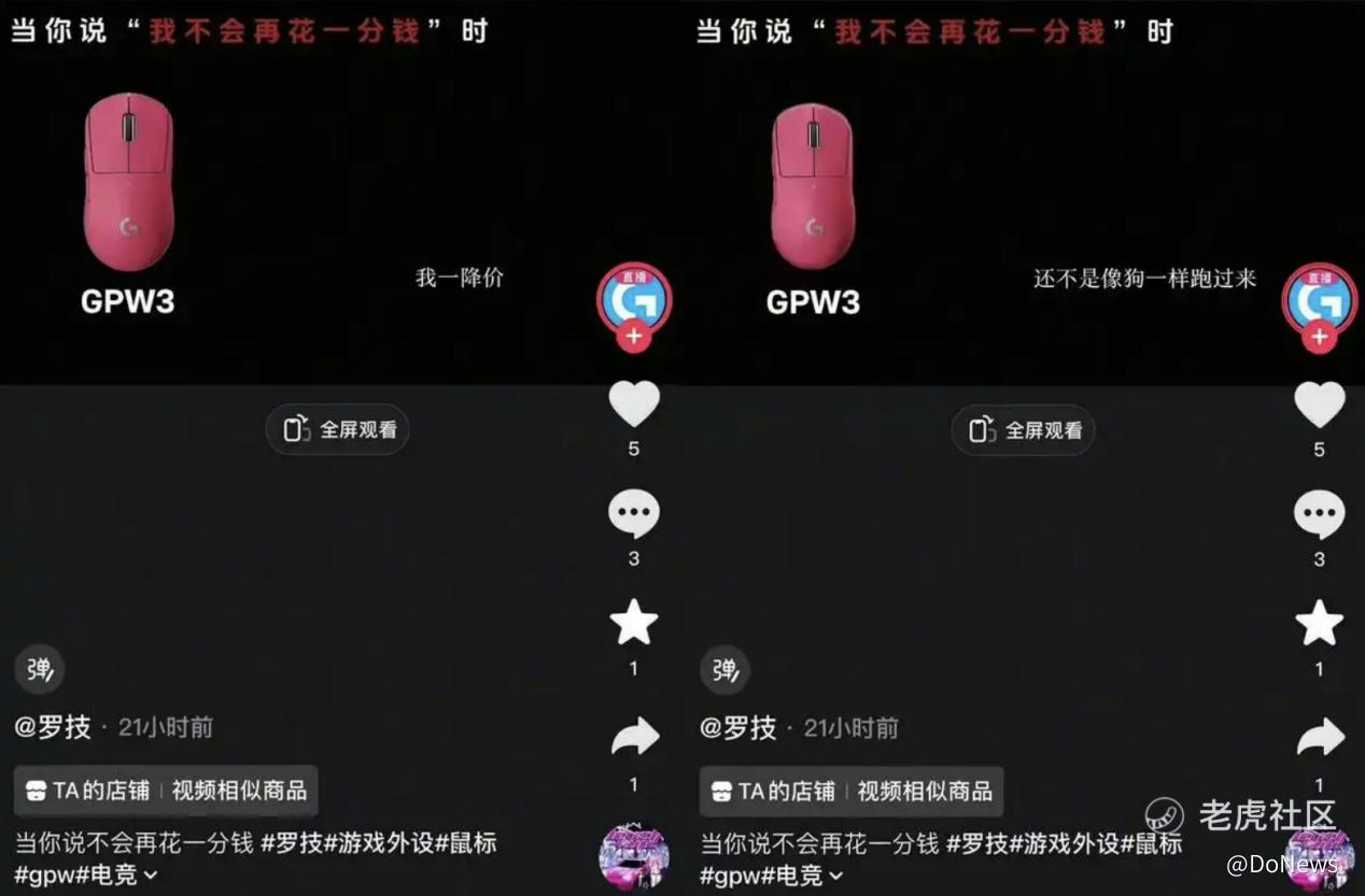 3月26日,罗技G官方旗舰店在抖音上发布了一条宣传其GPW3鼠标的视频,视频中没有产品参数讲解,没有使用场景演示,更没有核心功能介绍,只有一句极具侮辱性的文案:“当你说‘我不会再花一分钱’时,我一降价,还不是像狗一样跑过来。”