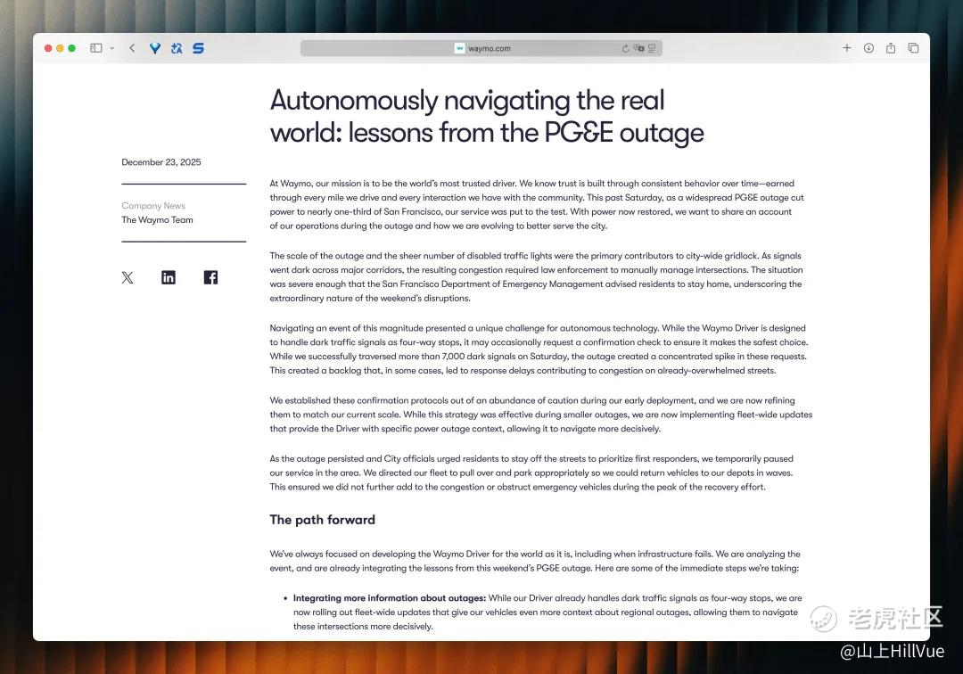 此前 Waymo 因为旧金山大规模停电导致红绿灯失效后,车辆不得不停滞在路上,原因也是自动执行了最小风险状态。