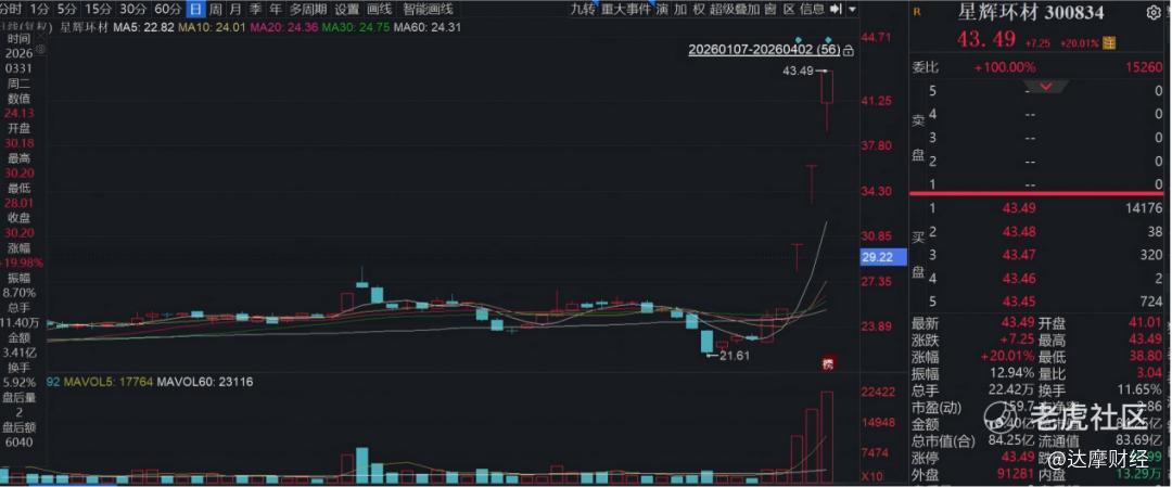 4月2日,星辉环材股价20CM涨停,收盘时股价升至43.49元/股,总市值达到84亿元。自3月31日以来,公司股价连续三个交易日涨停,累计涨幅达72.79%。