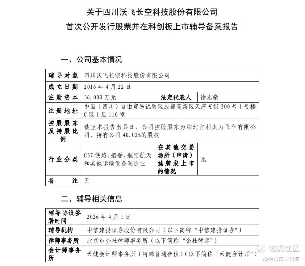4月3日消息,据证监会网站披露,四川沃飞长空科技股份有限公司(以下简称“沃飞长空”)于2026年4月2日在四川证监局办理辅导备案登记,拟首次公开发行股票并科创板上市,辅导券商为中信建投证券。