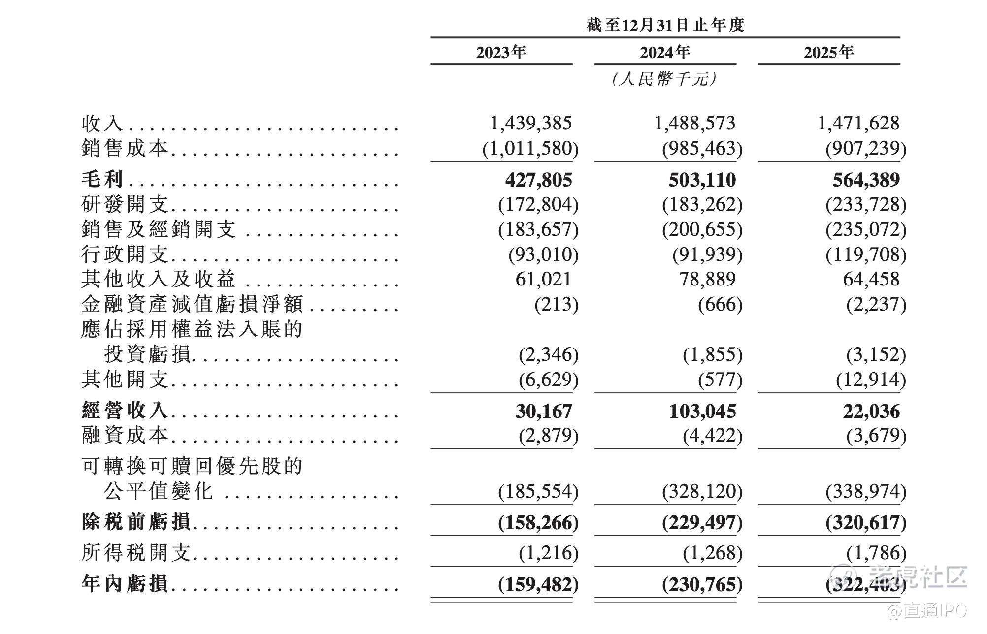 2023-2025年(下称:报告期),Aqara的营业收入分别约14.39亿、14.89亿、14.72亿元;毛利分别约4.29亿、5.03亿、5.64亿元,毛利率分别为29.7%、33.8%、38.4%;净亏损分别约1.59亿、2.31亿、3.22亿元,累计亏损约7.12亿元,经调整净利润分别约4529.3万、1.13亿、5685.4万元。