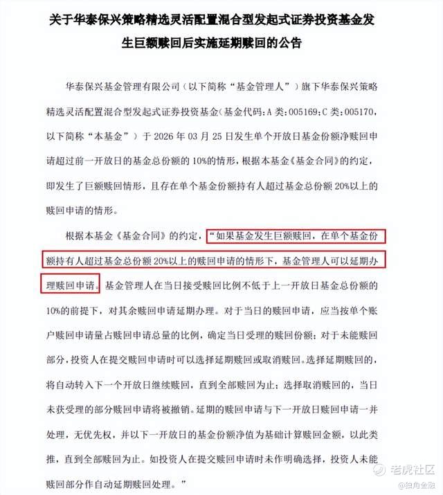 3月27日,华泰保兴基金发布公告称,旗下华泰保兴策略精选因在3月25日发生巨额赎回,且单日赎回比例超过基金总份额的10%,为保护全体持有人利益,决定对超出10%的部分采取延期赎回处理。